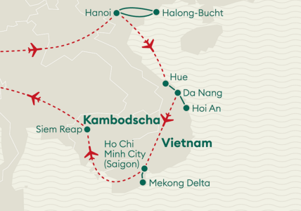 Erleben Sie die perfekte Mischung aus Kultur und Natur auf dieser Rundreise durch Vietnam und Kambodscha. Sie besuchen den Norden Vietnams mit Hanoi und der Halong Bucht, fahren weiter nach Zentralvietnam, um die alte Königsstadt Hue und einst bedeutende Hafenstadt Hoi An zu erkunden. Im Süden von Vietnam erwartet Sie die Metropole Saigon und das exotische Mekong Delta. In Kambodscha erkunden Sie die weltbekannten Tempelanlagen von Angkor Wat und besuchen den Tonle Sap See. Köstliche Küche und herzliche Gastfreundschaft inklusive.