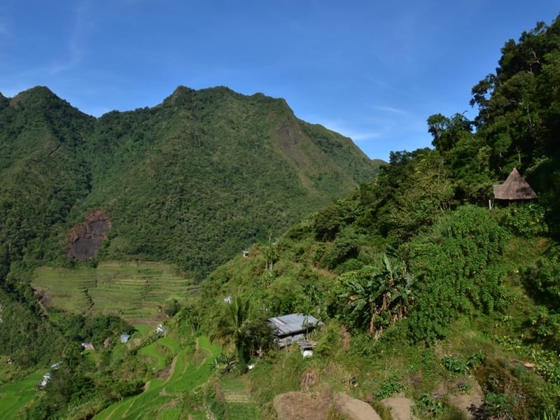 Am Morgen geht die Fahrt über den gewundenen Gebirgspfad des Mount Polis. Die schmale Strasse führt vorbei an moosbewachsenen Wäldern und dichter Vegetation, bis sich ein malerisches Mosaik aus Reis- und Gemüse-Terrassen öffnet, eingebettet in die klaren Gewässer des Chico-Flusses. Die niedrigeren Terrassen hier sind mit Steinen aus dem Fluss stabilisiert, und zwischen den Reiskulturen wachsen Süsskartoffeln und verschiedene Gemüsesorten. Kleine, strohgedeckte Hütten, sogenannte «allang», markieren die Hänge und dienen zur Aufbewahrung von Ernteüberschüssen und landwirtschaftlichen Vorräten