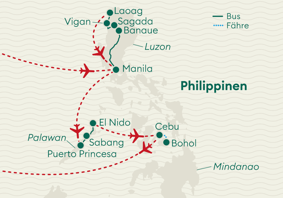 Flug mit Cathay Pacific ab Zürich via Hong Kong nach Manila. Rückflug ab Cebu via Hong Kong nach Zürich. Inlandflüge ab Laoag nach Manila, ab Manila nach Puerto Princesa und ab El Nido nach Cebu.