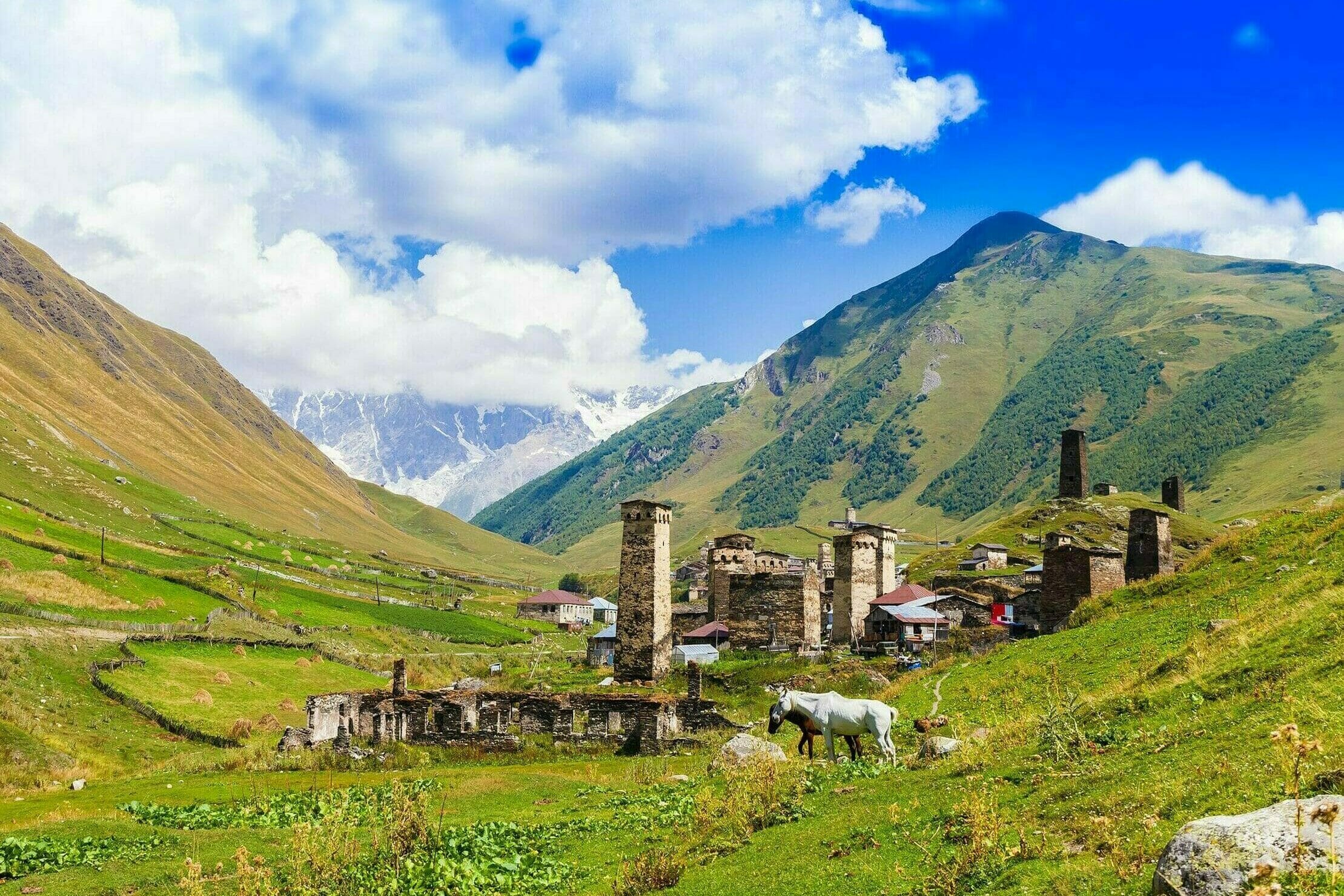 In aller Pracht und Schönheit entfaltet sich das versteckt gelegene Hochtal vor dem Panorama gewaltiger Gletscher, dazwischen uralte Bergdörfer mit winzigen Kirchlein samt herrlicher Fresken. Mit ihren Fünftausender-Gipfelriesen vergleichen sich die Georgier auch gerne mit der Schweiz. Hierher zu reisen, heisst (archaische) Kultur entdecken, Natur pur erleben. Mestia, malerisch im Flusstal gelegen, ist Hauptstadt Swanetiens und Topausgangspunkt für Wanderungen in die atemberaubende Bergwelt des Kaukasus. Besonders beliebt ist die Dreitageswanderung ins völlig abgeschiedene Ushguli, eine Gemeinschaft aus vier Dörfern. Zur höchsten Ansiedlung Europas, 2100 m ü. M., kann man auch auf abenteuerlichem Weg hinfahren, die alten Steinhäuser mit den berühmten Wehrtürmen bestaunen, im Banne des Schara, mit 5200 Metern der höchste Berg Georgiens.